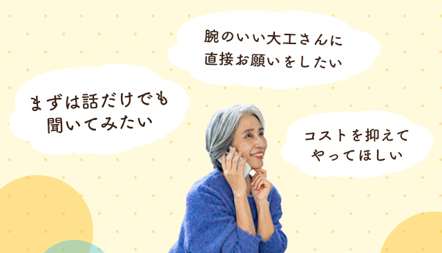 当社はお客様のお悩みを伺い、実績豊富で信頼できる大工さん・職人さんを派遣する独自のシステムを構築しています。迅速かつ適切にお悩みを解決いたしますので、まずはお気軽にご相談ください。