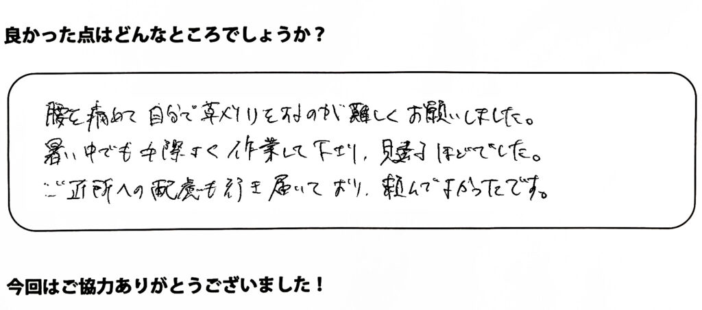 腰を痛めて自分で草刈りするのが難しくお願いしました。暑い中でも手際よく作業してくださり、見違えるほどでした。ご近所への配慮も行き届いており頼んでよかったです。