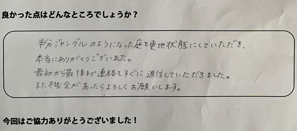 半分ジャングルのようになった庭を更地状態にしていただき本当にありがとうございました。最初から最後まで連絡もすぐに返信して頂きました。また機会があったらよろしくお願いいたします。