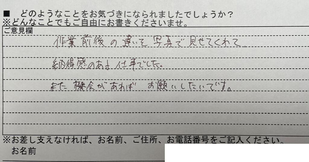 作業前後の違いを写真で見せてくれて納得感のある仕事でした。また機会があればお願いしたいです。