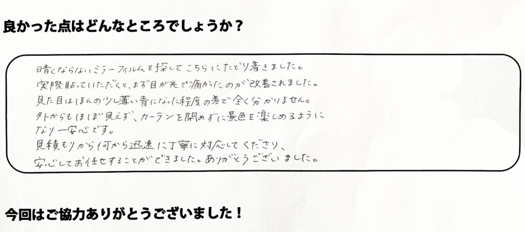 暗くならないミラーフィルムを探してこちらにたどり着きました。実際貼って頂くとまず目が光で痛かったのが改善されました。見た目はほんの少し薄い青になった程度の差で全くわかりません。外からもほぼ見えず、カーテンを閉めずに景色を楽しめるようになり一安心です。見積から何から丁寧に対応下さり、安心してお任せすることが出来ました。ありがとうございました。