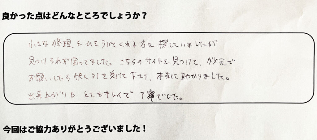 小さな修理を引き受けてくれる方を探していましたが見つけられず困っていました。こちらのサイトを見つけてダメ元でお願いしたら快く引き受けてくださり本当に助かりました。出来上がりもとてもキレイで丁寧でした。