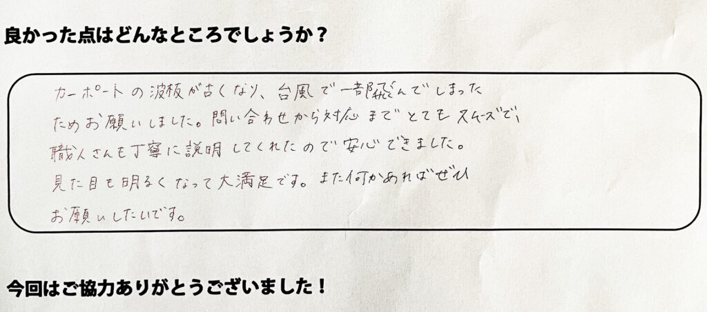 カーポートの波板が古くなり、台風で一部飛んでしまったためお願いしました。問い合わせから対応までとてもスムーズで職人さんも丁寧に説明してくれたので安心できました。見た目も明るくなって大満足です。また何かあればぜひお願いしたいです。