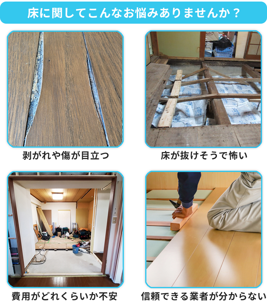 そんなときはどうぞ私たちにお任せください。経験豊富な職人が丁寧に施工し、安心して長く使える床へと生まれ変わらせます。